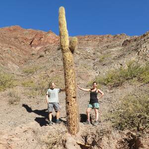 20. 5.: Po mrazivém ránu nastává překvapivě pěkný den (pokud nefouká) a my můžeme plnit plán šplhu po horách. A to doslova. Hory tu mají nádherné barvy, od modré a zelené, přes oranžovou a růžovou po červenou a hnědou v dáli. Kombinaci s pouštím prostředím, všudepřítomnými kaktusy a sem tam nějakou zvěří (poprvé vidíme naživo kolibříka, v poušti nás dost překvapuje) neodoláme a opouštíme vyšlapanou cestu. Do kopce to pěkně klouže a chytat se jde jen ostrých kamenů nebo kaktusů (zkoušíme obojí, je to špatný nápad), ale výhledy stojí za námahu. Dolů kopec v podstatě sjíždíme. Večer jdeme ještě na výhled na druhou stranu města. Původně bylo v plánu pivo a posezení u západu slunce, ale vysoké hory a oblačnost (není západ slunce) a hrozná zima (mrzne) nás přesvědčují o opaku. Jen pár fotek a mizíme zpět vařit a pivo si dát ve studeném, ale nemrznoucím ubytování.