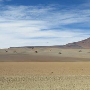 25. 5.: Spánek ve 4200m n.m. není úplnou samozřejmostí. Během usínání se naučeně zpomaluje dech. To, co stačí v nižších výškách, už není dost tady. Každou chvilku se člověk probudí a musí dechem dohánět, co předtím zanedbal. Všichni v určitých intervalech sípeme a zní to jako hromadná námaha po krátkém běhu. I tak si moc spánku neužíváme, v půl sedmé vstáváme, abychom o hodinu pozděj seděli v autě připraveni na další výlet. Vjíždíme do oficiálního národního parku, kde by toho mělo být k vidění ještč více. Kromě dalších lam i lam vikuň, třeba spousta lagun s nejrůznějším zbarvením podle rozpuštěných prvků. Poušť jako z obrazu Salvadora Dalího (je tak pojmenovaná, nicméně tady inspiraci nehledal) a hlavně gejzíry. Ty jsou důležité hned ze dvou důvodů. Skvěle se na ně kouká a bublající bahno smrdící sírou je prostě parádní zážitek, a pak gejzíry jsou horké a plné vody a v poušti z nich jde vytvořit bezva lázně! Samozřejmě využíváme. Večer jedeme přes červenou lagunu, pozorujeme párek pelikánů a jdeme se vyspat na další den – tentokrát ve 4350m n.m..