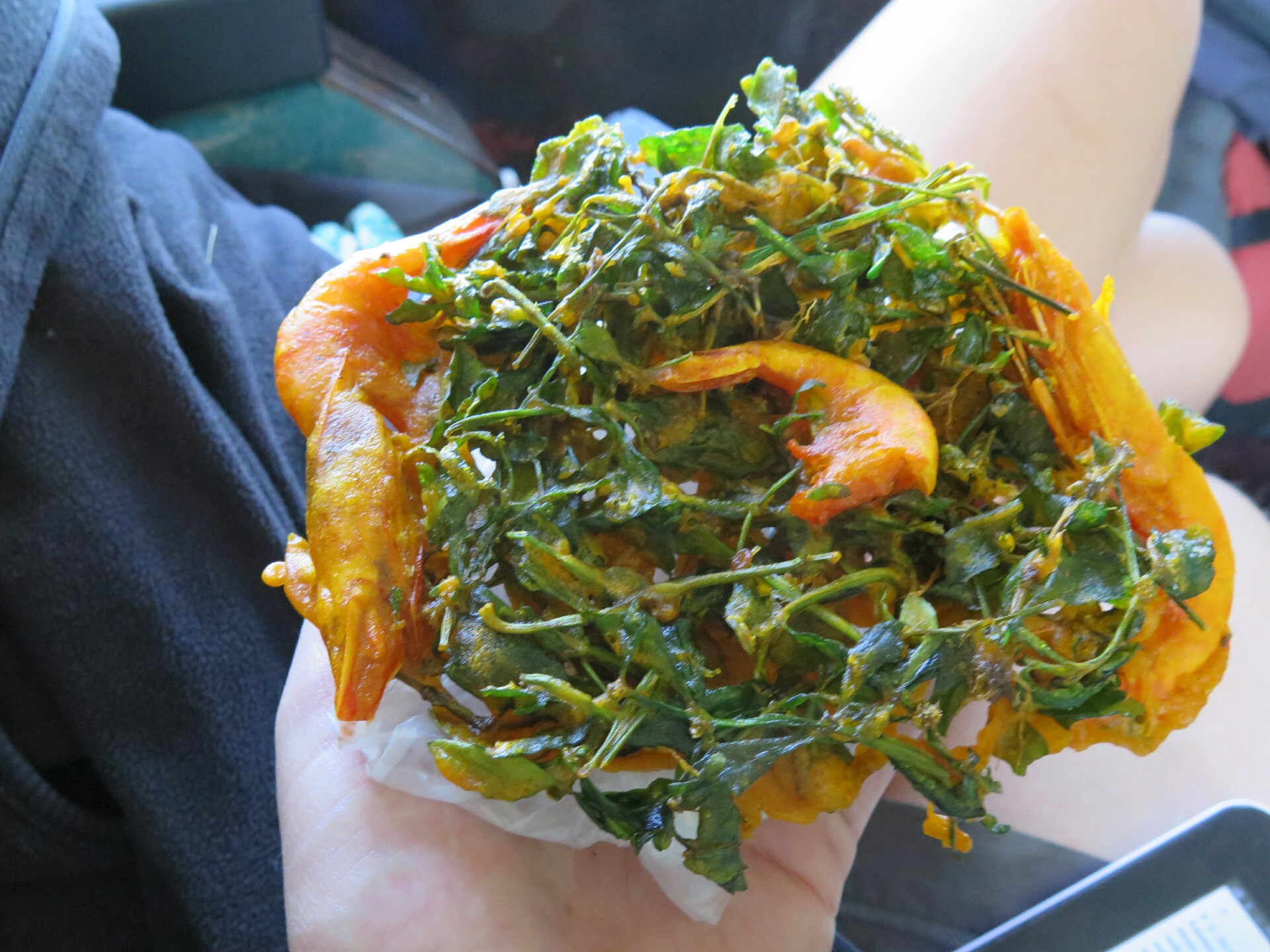 - Hluboce smažené krevety s čímsi zeleným.