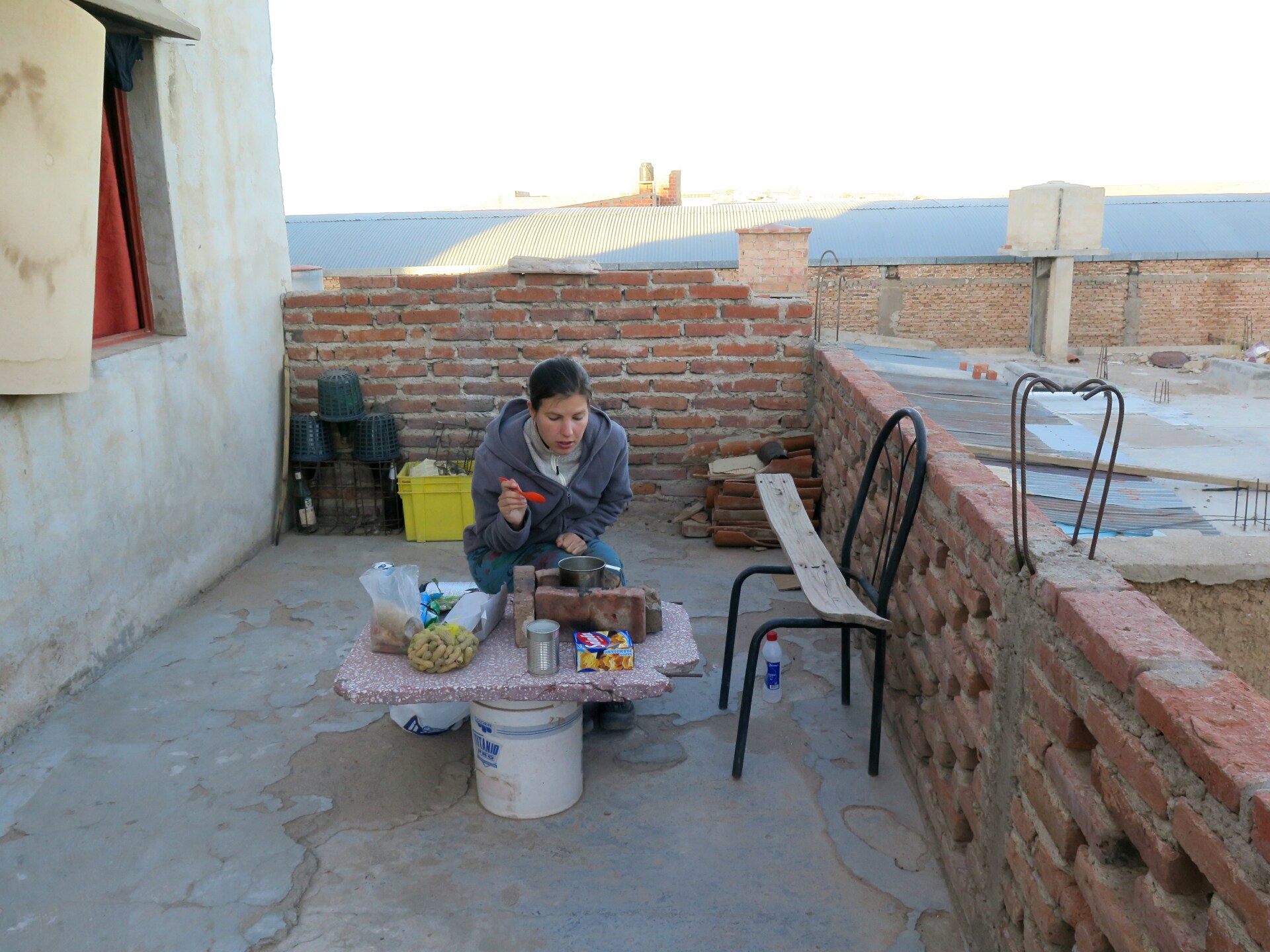 Vaření na terase s lahví lihu.